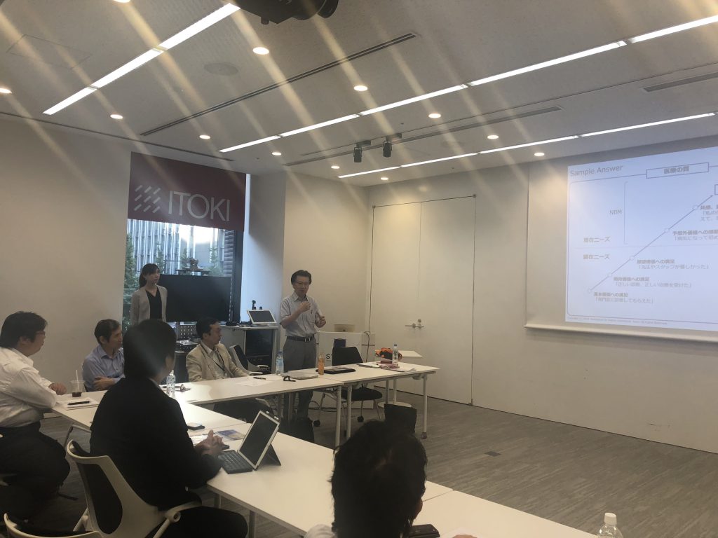 ワークでは、CXにおける顧客視点について学びました。全顧客が共通して期待するもの(顕在ニーズ)と顧客によって異なる付加価値(潜在ニーズ)があり、参加者全員がスターバックスでの自身の経験から顕在、潜在ニーズを考え、さらにPXに置き換えたうえで患者にとっての価値とは何かを話し合いました。